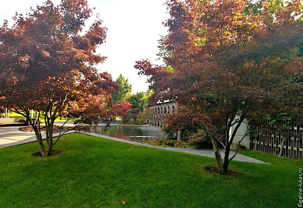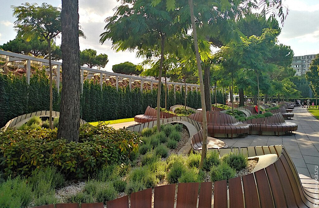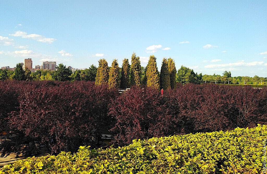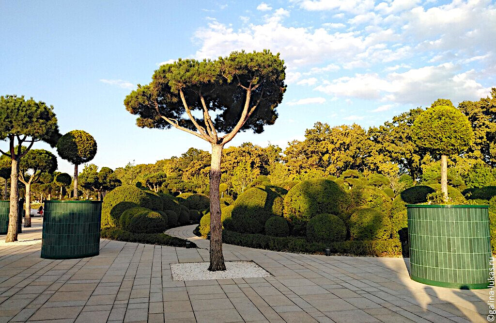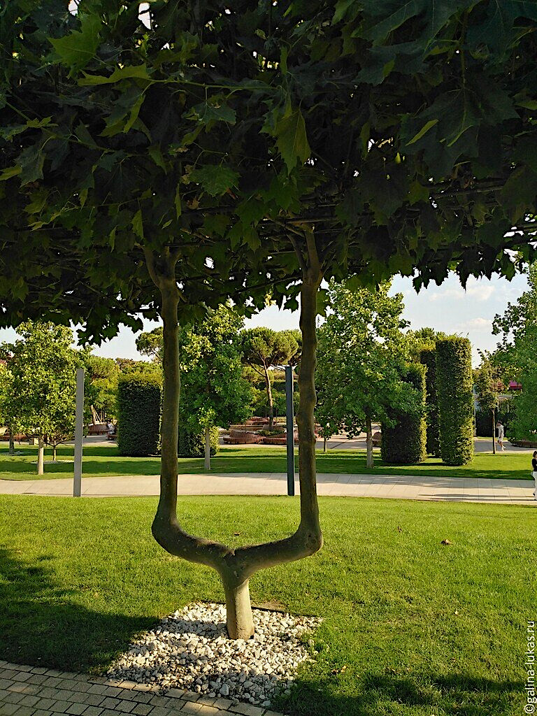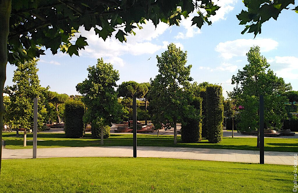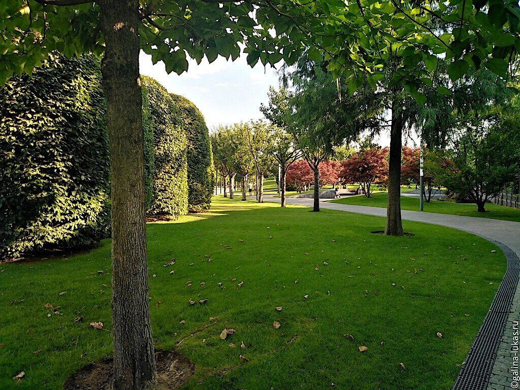 Парк довольно большой по площади. На его территории устроено множество зон: спортивные, детские, прогулочные зоны, переходящие одна в другую. Вдоль дорожек, справа, слева, впереди, позади деревья, кустарники разного роста, внешне некоторые очень причудливые. Мы медленно шли по этим дорожкам, переходили из зоны в зону, заглядывали в укромные уголки за зелёными изгородями.