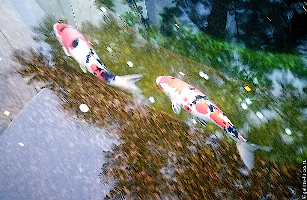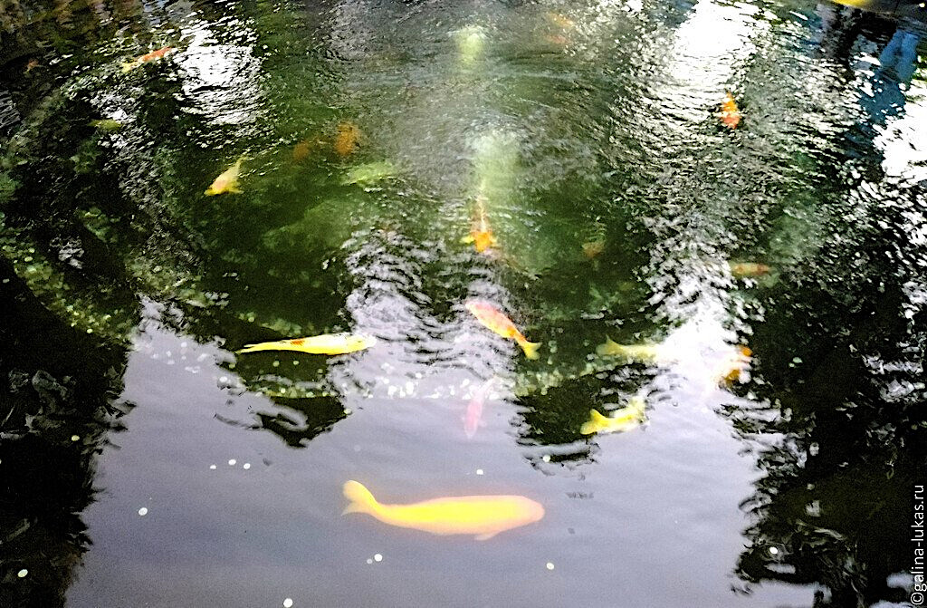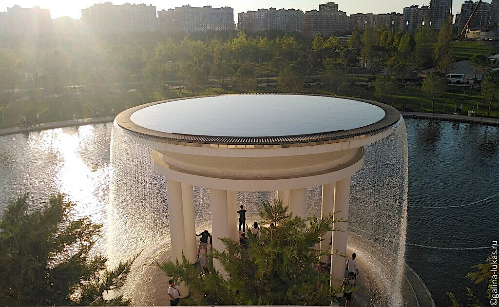 Особенно нас поразил фонтан ротонда на озере Любви. Вода падает на крышу круглой ротонды, тонкими струями спускается вниз на ступени, ступени спускаются в озеро. Зайдя под крышу ротонды, можно насладиться шумом падающей воды. В солнечных лучах фонтан ротонда и озеро выглядят завораживающе.